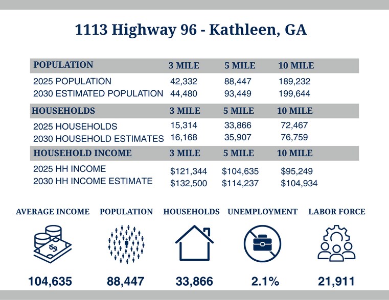 Positioned in one of the most active retail corridors in Houston County, this ±0.40-acre outparcel at 1113 Highway 96 in Kathleen, GA offers a prime opportunity for commercial development in a high-growth, high-visibility location. Fronting Woodland’s Coffee Roasters and situated within the Lake Joy Pavilion—anchored by Lowe’s Home Improvement at the signalized intersection of Highway 96 and Lake Joy Road—the site benefits from strong co-tenancy and consistent consumer traffic driven by surrounding national retailers and service providers. Zoned C-2 (Commercial) with all utilities available, the property is ideally suited for a variety of retail, restaurant, or service-oriented uses. With traffic counts exceeding 18,800 vehicles per day on Highway 96 and 17,300 vehicles per day on Lake Joy Road, this site delivers excellent exposure and accessibility in a densely populated and rapidly expanding area, making it a strategic investment for businesses seeking to capitalize on steady growth and established retail demand.