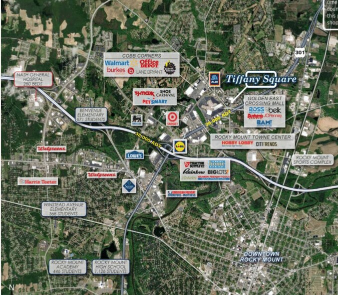 Des espaces sont maintenant disponibles au centre commercial Tiffany Square. Ce centre commercial est ancré par Ollie's Outlet et est situé dans le centre de Rocky Mounts' Retail District. Des espaces de coquille en ligne sont disponibles.