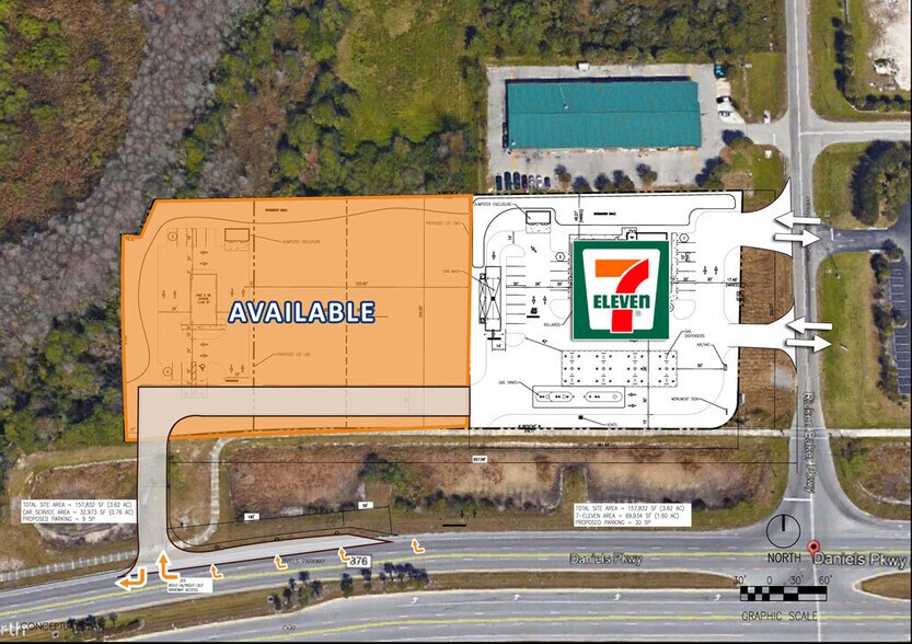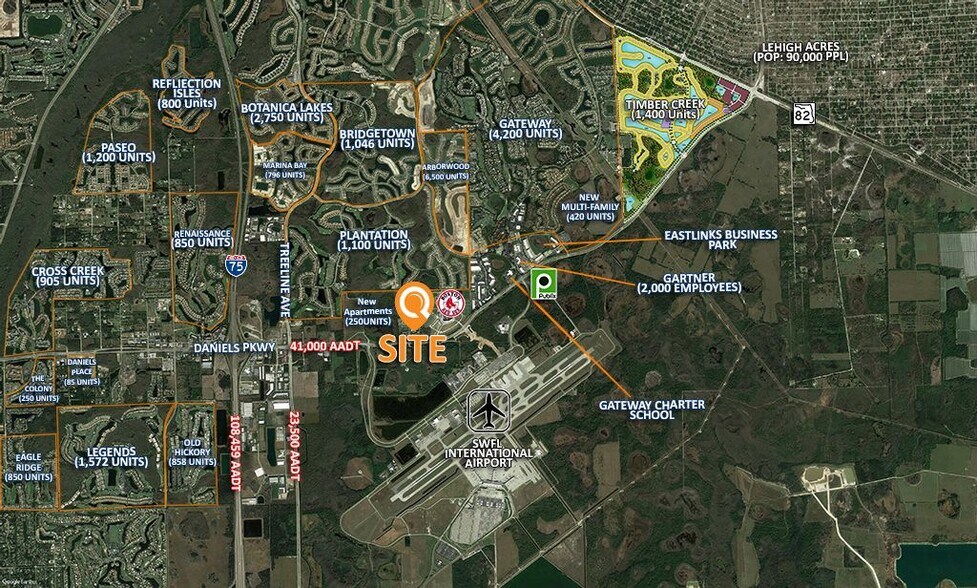 Des parcelles sont disponibles à côté du 7-Eleven nouvellement approuvé au coin nord-ouest de Daniels Pkwy et Rickenbacker Pkwy, avec accès complet. Un accès supplémentaire est disponible au point d'accès prévu à l'entrée ou à la sortie de Daniels Pkwy. Idéal pour la restauration rapide, le service automobile/réparation, les services médicaux ou autres services de détail. Daniels Pkwy est un corridor important reliant les collectivités de Lehigh Acres, Gateway et Timber Creek à Fort Myers.