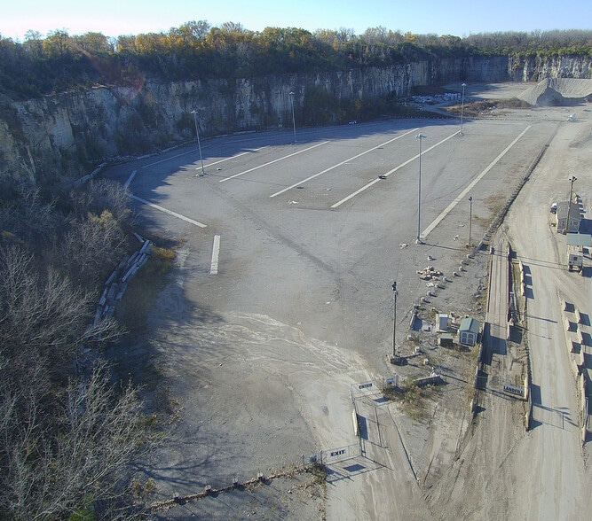- Espace de stationnement ou de cour de 5 acres gravillonné, clôturé, fermé et éclairé pour camions et remorques ou espace de cour avec des plaquettes de chariot en béton