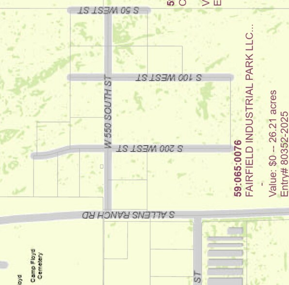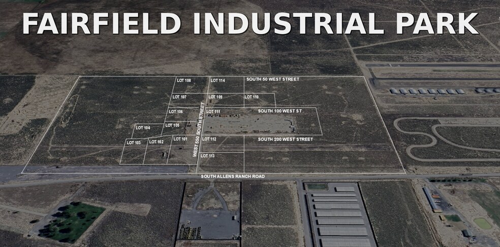 Phase 1 release of Fairfield Industrial Park, an approved, phased light industrial development located off Allens Ranch Road in Fairfield, Utah County. Fourteen (14) entitled industrial lots (approx. 1.1–1.7 acres each) with the ability to combine parcels for larger footprint users. Phase 1 infrastructure improvements scheduled for Spring 2026. Utilities will be stubbed to each lot. Flexible deal structures available: Land sale, Ground lease (NNN), Build-to-suit. Seller financing available. This offering provides multiple exit strategies: Resale of finished pads, Vertical development and hold, Ground lease income model, Owner-user build opportunities. Part of a larger 75+ acre master-planned industrial park with phased expansion. Limited light industrial inventory in western Utah County positions this project for long-term growth as infrastructure and regional expansion continue westward. Price shown is for lot 113. Contact listing agent for lot pricing, phasing plan, and development package.