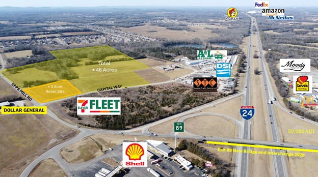 Contactez le courtier pour les prix 46,41 acres disponibles (+/-30 net) Divisibles en parcelles aussi petites que 5 acres Zonage GI – Ville de Murfreesboro Usages permis : entreposage, logistique, opérations d'équipements lourds, vente et service de flottes, location d'équipements, fabrication et commerce de détail Accès immédiat à l'autoroute, à seulement 0,5 mile de la sortie 89 Terrain plat Environ 2 000 pieds linéaires de façade routière, offrant une excellente accessibilité Services d'égout, d'eau et d'électricité disponibles sur place
