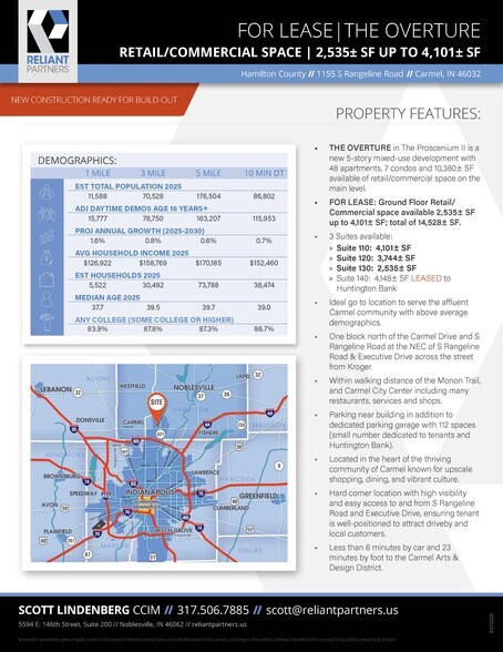L'OVERTURE dans The Proscenium II est un nouveau développement mixte de 5 étages comprenant 48 appartements, 7 condos et environ 10 380 pi² d'espace commercial/de détail disponible au rez-de-chaussée. • **À LOUER** : Espace commercial/de détail au rez-de-chaussée disponible de 2 535 pi² à 4 101 pi²; total de 14 528 pi². • **3 espaces disponibles** : » **Suite 110** : environ 4 101 pi² » **Suite 120** : environ 3 744 pi² » **Suite 130** : environ 2 535 pi² » **Suite 140** : environ 4 148 pi² (LOUÉE à Huntington Bank) • Emplacement idéal pour desservir la communauté aisée de Carmel avec des données démographiques supérieures à la moyenne. • Situé à un pâté de maisons au nord de Carmel Drive et S Rangeline Road, à l'angle nord-est de S Rangeline Road et Executive Drive, en face de Kroger. • À distance de marche du Monon Trail et du Carmel City Center, qui regroupe de nombreux restaurants, services et boutiques. • Stationnement à proximité de l'immeuble, en plus d'un garage de stationnement dédié avec 112 places (un petit nombre réservé aux locataires et à Huntington Bank). • Situé au cœur de la communauté dynamique de Carmel, reconnue pour ses boutiques haut de gamme, sa gastronomie et sa culture vibrante. • Emplacement stratégique à un coin de rue très visible avec un accès facile depuis S Rangeline Road et Executive Drive, garantissant une excellente visibilité pour attirer les clients locaux et de passage. • À moins de 6 minutes en voiture et 23 minutes à pied du Carmel Arts & Design District.