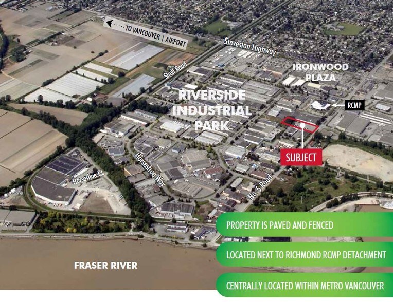 PROPRIÉTÉ : La propriété est pavée et clôturée. Située à côté du détachement de la GRC de Richmond. Emplacement central dans la région métropolitaine de Vancouver. ZONAGE : IBI (Industriel) permettant des usages industriels légers, ainsi que des usages de bureau. Idéal pour la distribution et l'entreposage. TAUX DE LOCATION : 1,95 $ par pied carré brut ou 13 166 $ par mois DIMENSIONS DU TERRAIN : Façade de 170 pieds Profondeur de 479 pieds DISPONIBILITÉ : Immédiatement EMPLACEMENT : Située juste au sud de Steveston Highway et de No. 5 Road, cette propriété se trouve dans le Riverside Industrial Park, près du centre commercial Ironwood qui comprend London Drugs, Canadian Tire, Boston Pizza, Brown's Restaurant et Starbucks. La propriété bénéficie d'un accès rapide à l'autoroute 99, à la frontière américaine ou au centre-ville de Vancouver.