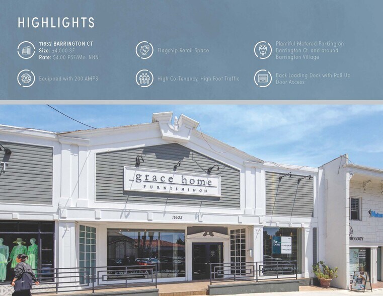 Exceptional opportunity to secure 4,000 SF of prime flagship retail in one of the most coveted and highly trafficked locations in Brentwood Village. Situated at 11632 Barrington Court, this rare offering features an expansive open floor plan that provides maximum flexibility for a wide variety of retail, showroom, wellness, or restaurant concepts. The space benefits from strong co-tenancy with top-performing local and national operators including Belwood Bakery, Kreation, Clark St. Bakery, Hank’s Bagels, Bella Cures, and Starbucks, creating a powerful retail ecosystem that drives consistent foot traffic and consumer demand. Surrounded by affluent residential neighborhoods, premier schools, and major employment centers—including UCLA and Century City—the property sits within a high-income trade area with exceptional daytime and evening activity.