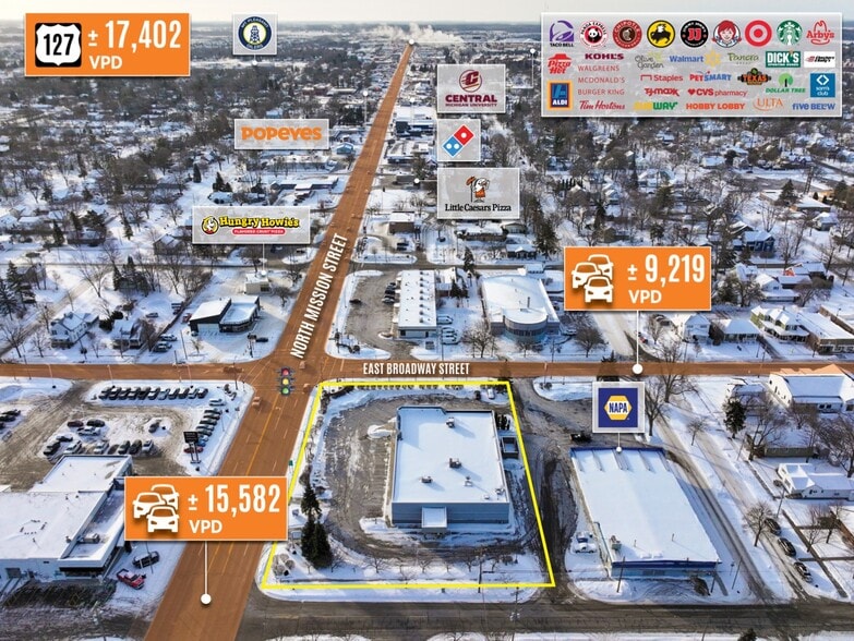 Ancien Rite Aid avec service au volant disponible à la location au cœur de Mt. Pleasant, MI. Situé à l'angle nord-ouest de Mission Street et E. Broadway, ce bien bénéficie d’un emplacement idéal juste au nord de l’Université Central Michigan, la 4e plus grande université de l’État, accueillant plus de 14 000 étudiants. La propriété est située à une intersection avec contrôle de la circulation, offrant un accès facile aux deux routes principales, et dispose d’un vaste stationnement.