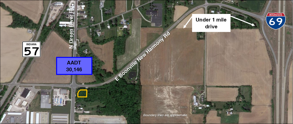 Le lot 1 se trouve à une intersection signalée à l'angle des chemins Boonville New Harmony et N Green River, à environ deux minutes de l'Interstate 69. Il y a des coupes de bordure approuvées pour accéder au lot 1 sur le chemin Green River N et sur le chemin Boonville New Harmony.