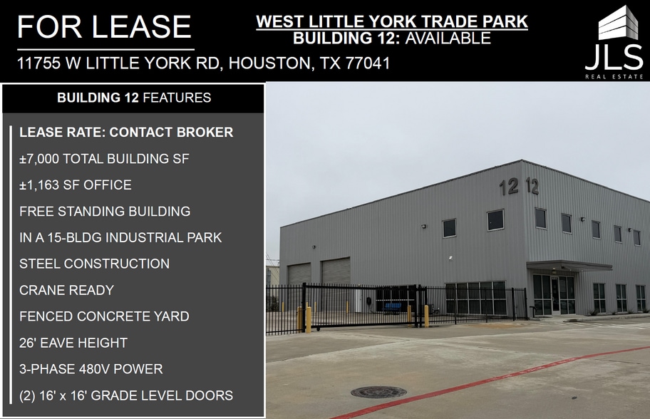 West Little York Trade Park est un parc industriel de quinze bâtiments à locataire unique situé sur West Little York Road, dans le nord-ouest de Houston, au Texas. Le parc offre des bâtiments en acier récemment construits, à seulement un mile de Beltway 8/Sam Houston péage. Le West Little York Trade Park offre un chargement au niveau des gradins, un entreposage dans la cour pavé ou clôturé individuel pour chaque bâtiment, et les bâtiments sont prêts à être munis de grues. La loi du Texas exige que tous les titulaires de licence fournissent le formulaire Informations sur les services de courtage aux acheteurs, locataires, vendeurs et propriétaires potentiels : https://www.jlscre.com/static/sitefiles/IABS_Form_JLS.pdf
