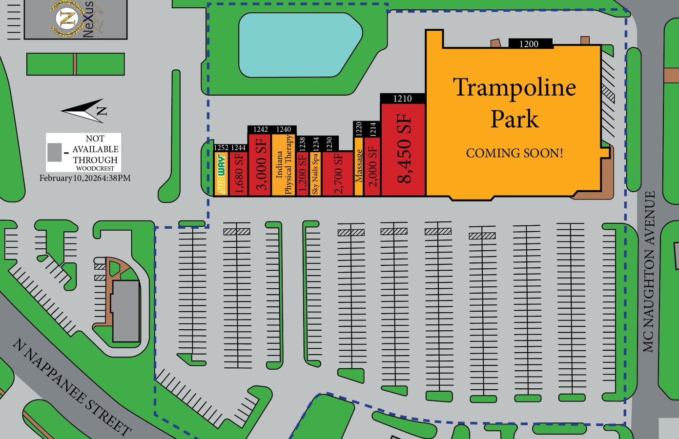 - Ancré dans un parc de trampolines avec un mélange sain de petits locataires comme Subway, GNC, Sky Nails Spa et Indiana Physiothérapie.
