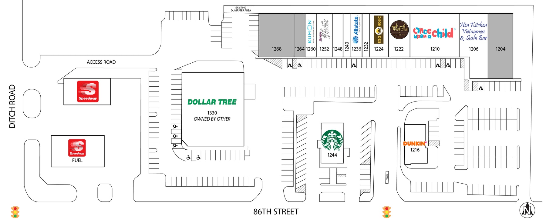 Centre commercial idéalement situé à moins de 1 mile à l'est de l'hôpital Saint-Vincent Situé dans un quartier animé et aisé de Northside Espace très visible disponible sur les extrémités Comptes quotidiens de la circulation : 31 833 sur 86th Street et 14 357 sur Ditch Road