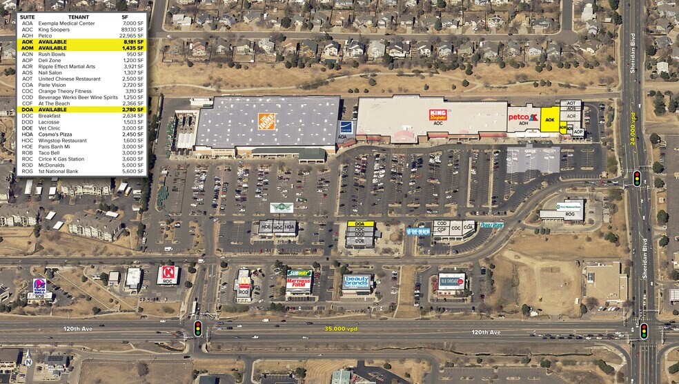 Strong King Soopers et Home Depot ont ancré le centre commercial. Épicerie la plus proche du centre civique Broomfield proposé. Abondance de stationnement et excellente visibilité sur la 120e Avenue. Strong King Soopers et Home Depot ont ancré le centre commercial. Excellente visibilité sur la 120e Avenue. Épicerie la plus proche du centre civique Broomfield proposé. Situé à une intersection signalée.