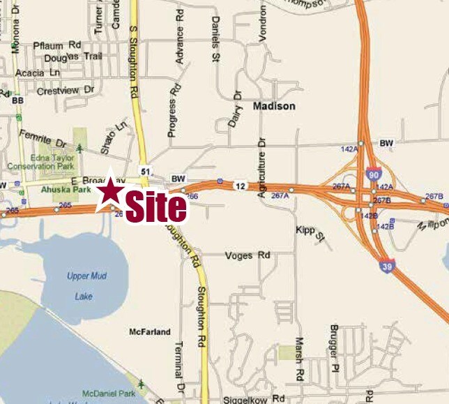Deux parcelles disponibles (5,64 acres et 1,79 acre totalisant 7,43 acres) situées à l'angle de E. Broadway et du chemin S. Stoughton ; façade combinée de 677 pi le long de E. Broadway ; zone commerciale zonée dans un district FIT ; située près de la première intersection lumineuse contrôlée de la route Beltline Ouest ; Voir la carte d'arpentage certifiée ci-jointe ; Prix de vente : 13,95 $/carré Ft.