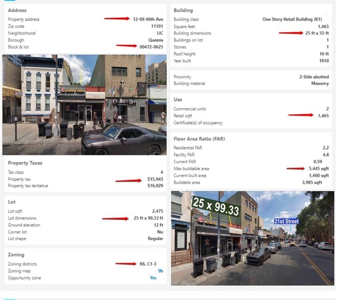 Address: 12-09 40th Ave, LIC, NY, 11101 00472-0625 Lot Size: 25 x 99.33 (2,475 SF) Zoning: R6, C1-3 Can Build minimum 5,500 SF Currently 2 commercial stores combined 25 x 55 Building size.