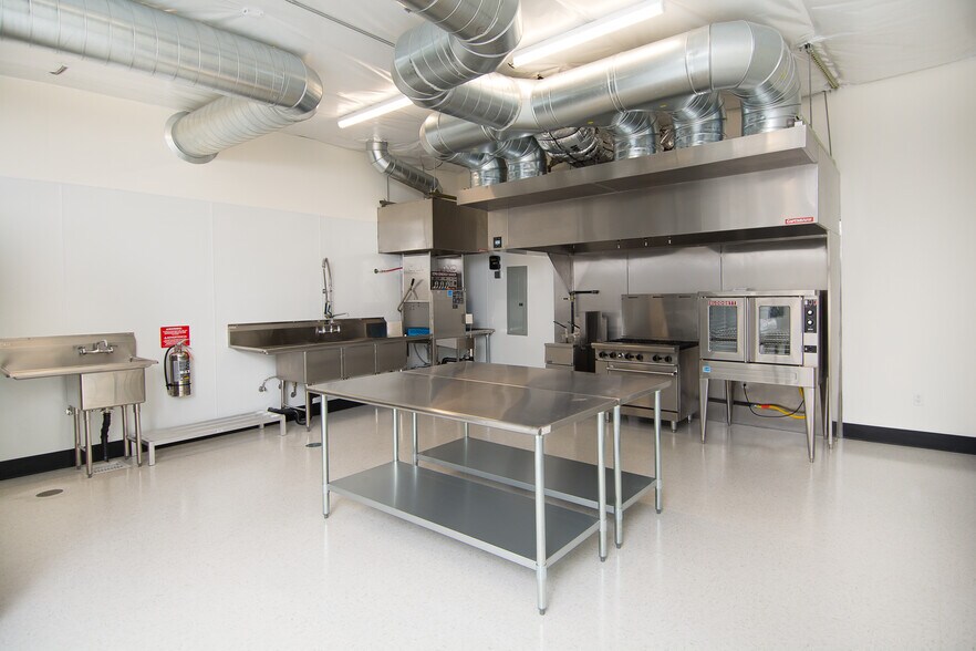 Kitchen Suite A offers a blend of industrial and modern aesthetics. The space boasts a fully-equipped commercial kitchen with professional grade equipment, private ADA restroom, and versatile layout make this an ideal space for any culinary business. Professional equipment includes: 8'x10' walk-in cooler, 6-burner gas range with oven, 10' Type 1 exhaust hood, gas convection oven, deep fryer, 2 & 3 compartment sinks, upright ventless dishwasher, hand sink, mop sink in janitor closet, grease trap, and floor drain. All equipment is professionally maintained.