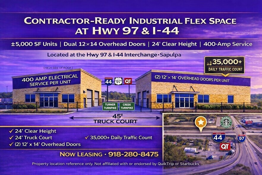 New construction contractor-ready ±5,000–10,000 SF industrial flex warehouse space available for lease at the signalized Hwy 97 & I-44 interchange in Sapulpa within Tulsa’s west industrial corridor. Two mirrored small-bay suites are available individually or combined and are designed to support contractor shops, service fleet operators, logistics users, and light industrial tenants requiring efficient regional access. Each ±5,000 SF suite includes dual 12’ × 14’ grade-level overhead doors, approximately ±1,000 SF of office build-out space, HVAC-controlled restroom, 400-AMP 3-phase electrical service, and 24’ clear height (20’ low side) warehouse space suitable for equipment storage, vehicle staging, and service operations. The mirrored building configuration creates a shared ±45-foot-wide central concrete truck maneuvering court between the buildings, supporting trailer circulation, contractor vehicles, and fleet access. Dedicated parking is provided per suite with additional vehicle parking available along approximately 150 feet of N 10th Street frontage adjacent to the property. The site offers strong visibility at the Hwy 97 & I-44 interchange with exposure to approximately ±35,000 vehicles per day and is located adjacent to QuikTrip Travel Center and Starbucks, providing convenient access for employees and service operators. Immediate regional connectivity is available to I-44, Hwy 97, US-75, Hwy 169, the Creek Turnpike, and the Turner Turnpike, allowing efficient access throughout the Tulsa metro and surrounding industrial corridors. Suites may be leased individually (±5,000 SF) or combined (±10,000 SF total) depending on tenant requirements. Additional covered storage or vehicle parking flexibility may be accommodated within warehouse space if needed. Ideal users include contractor shops, service fleet operators, logistics support users, equipment storage tenants, and light industrial warehouse operations seeking visibility and access within Tulsa’s west industrial corridor.