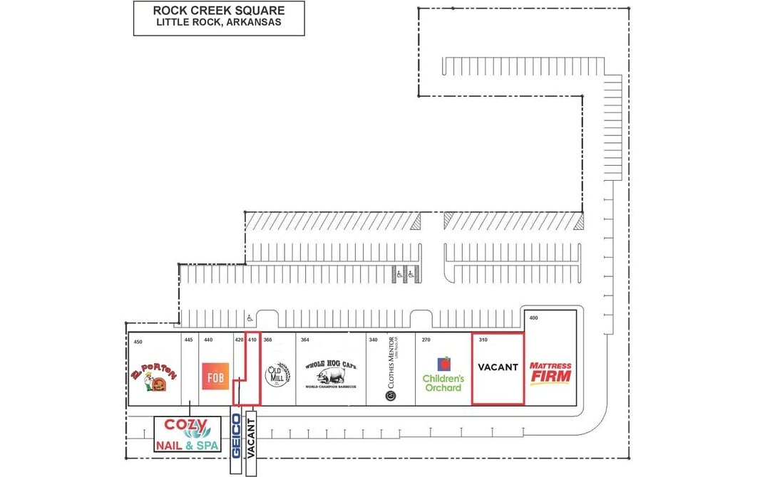 Rock Creek Square est un centre commercial très visible, stratégiquement situé à l'angle bien en vue de Markham Street et Bowman Road, dans l'ouest de Little Rock. Ce centre bien établi propose une variété de locataires locaux et nationaux, notamment Whole Hog Café, GEICO, Full Out Barre, Old Mill Bread Bakery & Café, Children’s Orchard, et Cozy Nail & Spa.