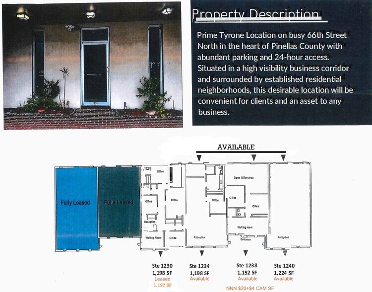 CRS-1 Zoning allows for General & Medical Offices, Health Clubs, Salons, Wellness Centers, and Day Spas. There is adequate off-street parking and signage available. Your choice of 3 suites available, ranging from 1,152 SF to 1,224 SF. Base annual rent is $20 SF, plus $4 SF annual CAM charges.