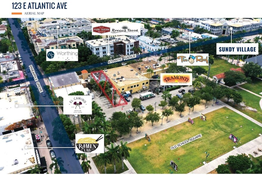 le commerce de détail se situe entre Tramonti et Sazio, deux lieux emblématiques très fréquentés de Delray Beach. Tramonti pour le déjeuner et le dîner, et Sazio pour sa tranche de pizza bien remplie de fin de soirée