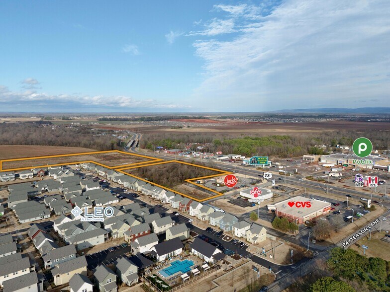 ADRESSE Côté ouest de la route américaine 231/431 Au nord de Patterson Lane Comté de Madison (AL.) 35759 TAILLE 8.1 Acres de parcelles externes divisibles + 6,1 acres disponibles AU SUJET DE LA PROPRIÉTÉ Ces parcelles de vente au détail sur l'autoroute 231 sont stratégiquement positionnées de l'autre côté de l'autoroute par rapport à un centre commercial ancré au Publix et jouxtant le luxueux LEO de 266 unités à Flint Crossing. Situés au cœur du corridor commercial le plus important de Meridianville, les sites offrent un accès facile et une excellente façade le long d'une zone à fort trafic de plus de 30 000 VPD. FAITS SAILLANTS DE LA PROPRIÉTÉ Points d'accès multiples Tous les services publics disponibles sur le site, y compris les égouts sanitaires La majorité des terres sont pratiquement prêtes à être payées Pas de zonage ni de plaine inondable Toutes les parcelles peuvent être subdivisées au besoin