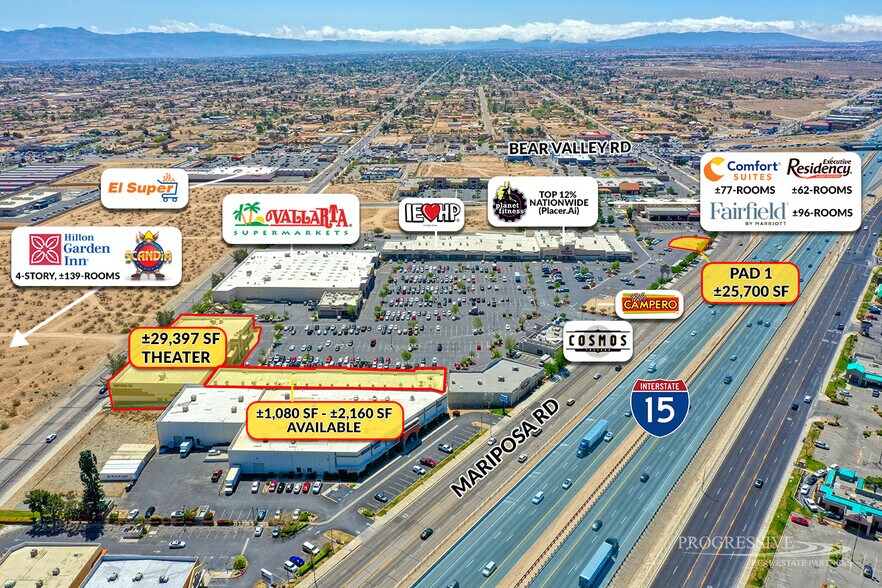±25,700 SF Pad with Freeway Visibility for Lease Anchored by a ±75,040 SF Vallarta Grocery Store that according to SiteSeer Pro is their #2 location Co Jr. Anchors include Planet Fitness (Top 12% Nationwide), Best Deal Furniture, & Inland Empire Health Plan with over 1.5M members Entire ±166,417 SF shopping center has excellent visibility from the I-15 Freeway which averages over 94,000 CPD Population of over 302,000 people within a 20 minute drive time. Conveniently located in close proximity to the Mall of Victor Valley that includes Macy’s, Dicks Sporting Goods, Barnes & Noble, JC Penney, and 100 more stores