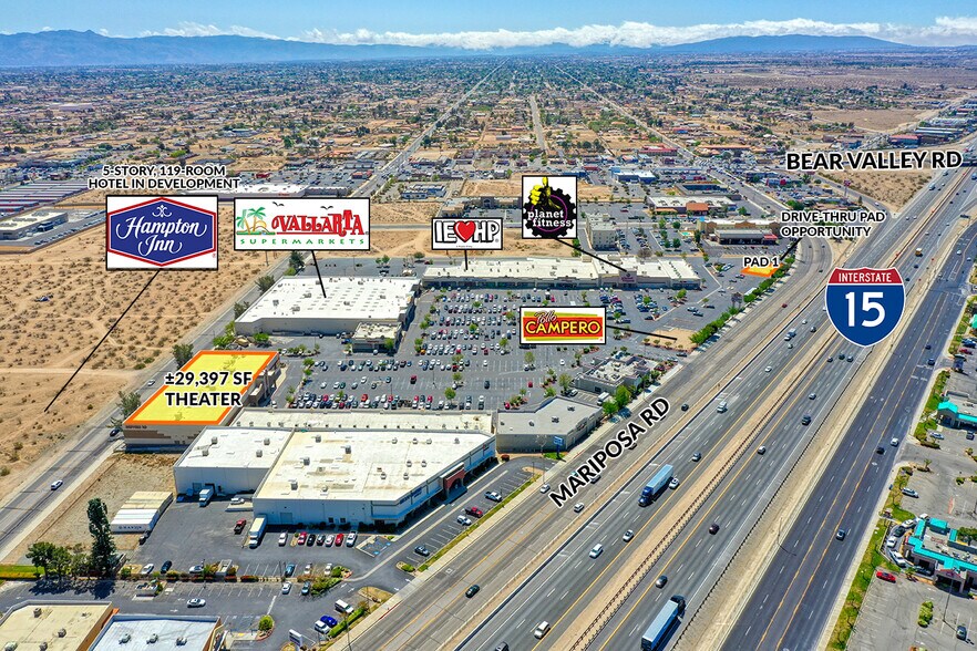Cinéma à 10 écrans de ±29 397 SF à louer ±1 200- ± 2 400 pieds pieds 2 400 SF locaux commerciaux de deuxième génération à louer Ancré par une épicerie de ±75 040 SF Vallarta qui, selon SiteSEER Pro, est leur emplacement #2 Comté Jr. Les présentateurs comprennent Planet Fitness, Best Deal Furniture et Inland Empire Health Plan avec plus de 1,5 million de membres L'ensemble du centre commercial de ±166 417 pi2 offre une excellente visibilité depuis l'autoroute I-15, qui affiche en moyenne plus de 98 000 DPC Population de plus de 297 000 personnes dans un trajet de 20 minutes Position potentielle d'un panneau principal des deux côtés d'un panneau impressionnant sur un pylône visible depuis l'autoroute I-15 Idéalement situé à proximité du centre commercial de Victor Valley qui comprend Macy's, Dicks Sporting Goods, Barnes & Noble, JC Penney et 100 autres magasins