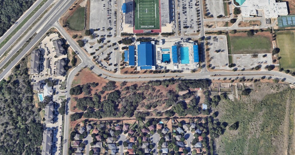 **Superficie et Emplacement :** Environ 2 acres, situées à l'angle sud-est de S Hausman Road et Champions Gate, juste à l'est de Loop 1604—une zone à fort trafic idéale pour la visibilité et l'accessibilité. **Commodités environnantes :** Le site se trouve en face du complexe sportif Dub Ferris Athletic Complex, du NISD Natatorium, du Northside Swim Center et du lycée Brandeis High School. Il bénéficie également de la proximité de l'Université du Texas à San Antonio (UTSA), qui compte environ 35 000 étudiants à proximité—ce qui augmente la population active en journée et la demande potentielle. **Exposition au trafic :** Les flux de circulation sont élevés—environ 7 600 véhicules par jour sur S Hausman et 110 000 sur Loop 1604—offrant une excellente visibilité pour les passages en voiture.