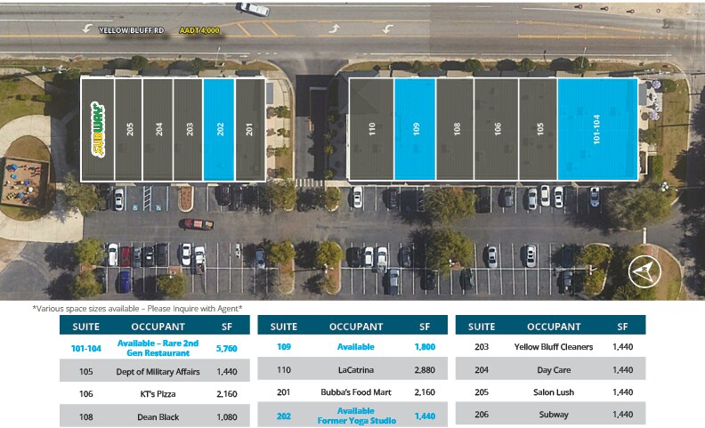 Yellow Bluff Square 12400 Yellow Bluff Rd 1 440–9 000 pi² d'espace disponible • Commerce de détail • Jacksonville, FL 32226