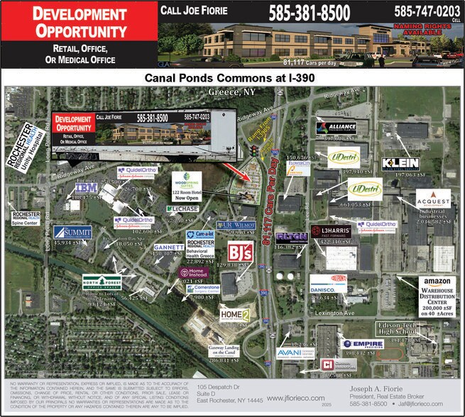 Canal Ponds Commons est situé à la sortie et à l'entrée bretelle de l'autoroute I-390 à l'avenue Ridgeway • À seulement 5,3 milles de l'aéroport international du Grand Rochester L'aéroport et 89 091 voitures passent à cet endroit tous les jours. • Canal Ponds Commons a proposé une Bureau médical et immeuble de détail de 54 000 pieds carrés, une banque parcelle avec service au volant, et/ou une plateforme de restaurant avec une grande exposition. • Ces édifices seront construits à côté du nouvel hôtel Woodspring, qui est actuellement en construction sur ce site. • Les étangs du canal Communes font face à un million ± pieds carrés de des locaux à bureaux en col blanc, y compris IBM, Johnson & Johnson, Summit FCU et Unity Health, pour n'en nommer que quelques-uns. Il y a 5 millions ± pieds carrés de superficie industrielle, manufacturière et haute technologie de l'espace situé du côté est de l'autoroute I-390, directement en face de ce site. • Grande exposition • Grande visibilité et accès facile au I-390 • Taille du développement : 10,86 ± acres au total • Site de l'hôtel Woodspring : hôtel de 124 chambres actuellement en construction • Bureau médical ou détail proposé : 54 000 ± SF (immeuble de 2 étages) • Restaurant proposé : 7 000 ± SF (1,8 ± acres) • Tampon de banque proposé : 3 200 ± SF avec Drivethru Prix de vente : Sur demande