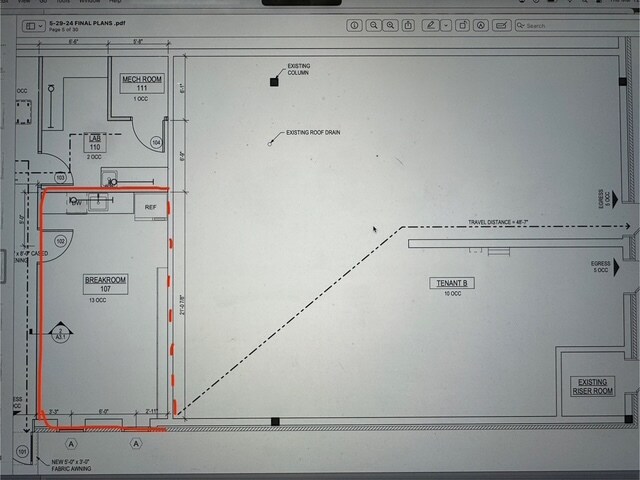 The current shell space is approx 1,525 SF and will have the option to use finished "breakroom" space in adjacent office seen on drawing outlined in red which is additional ~270 SF if needed