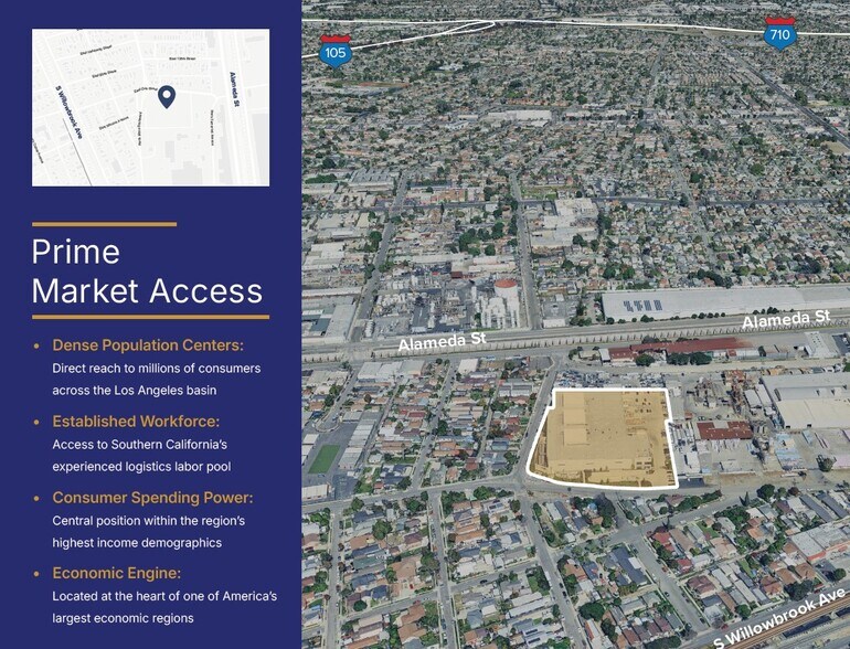 Westcore Power & Logistics Hub sets a new benchmark for Southern California distribution. This Class A industrial facility, strategically located in Compton, offers ±94,875 SF of modern logistics space designed for high-performance operations. Currently undergoing a complete refurbishment, the property delivers exceptional infrastructure tailored for companies seeking speed, scalability, and market reach. Positioned at the epicenter of the South Bay industrial corridor, the hub provides direct connectivity to Interstates 105, 110, 405, and 5, ensuring rapid access to Los Angeles, Long Beach, and the region’s major consumer markets. Proximity to the Ports of LA and Long Beach (16 miles), BNSF and Union Pacific intermodal hubs (12 miles), and LAX (15 miles) makes this location ideal for import/export and last-mile distribution strategies. This property has 5 megawatts of primary power on-site for to support a wide array of uses requiring significant power. Additional power could possibly be added. Call brokers for details.
