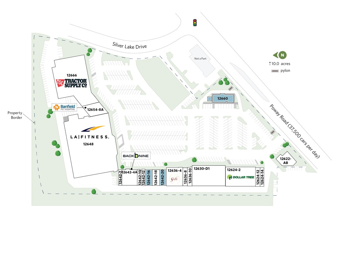 Suite 12660 is a ±2,500 SF first-floor retail space at Poway Crossings, a high-performing community shopping center on Poway Road anchored by LA Fitness and Dollar Tree with strong visibility and daily traffic.
