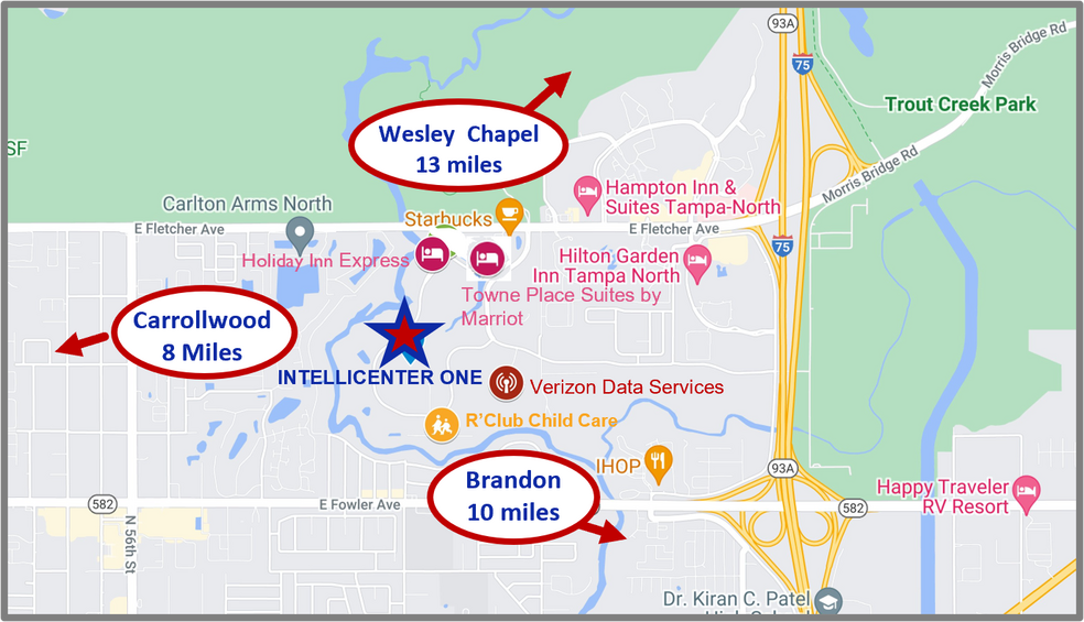Le 12653 Telecom Drive, connu sous le nom d'Intellicenter, a été construit en 2008 et présente des finitions intérieures de haute qualité. L'édifice est doté de grandes plaques de plancher efficaces et d'un ratio de stationnement élevé, qui sont tous deux idéaux pour les grandes entreprises. L'immeuble se trouve dans un parc d'affaires comprenant un centre de données Verizon, Adecco Staffing et de nombreux locataires médicaux. Il y a des restaurants, des hôtels et des commerces de détail dans les environs immédiats qui offrent des commodités aux employés.