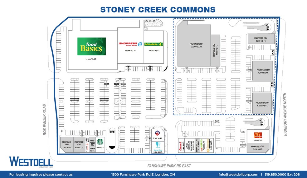 Ce site de développement de 20 acres entièrement zoné est avantageusement positionné au nord-est de London. Le projet comprendra plus de 250 000 pieds carrés d'espace commercial une fois entièrement construit.