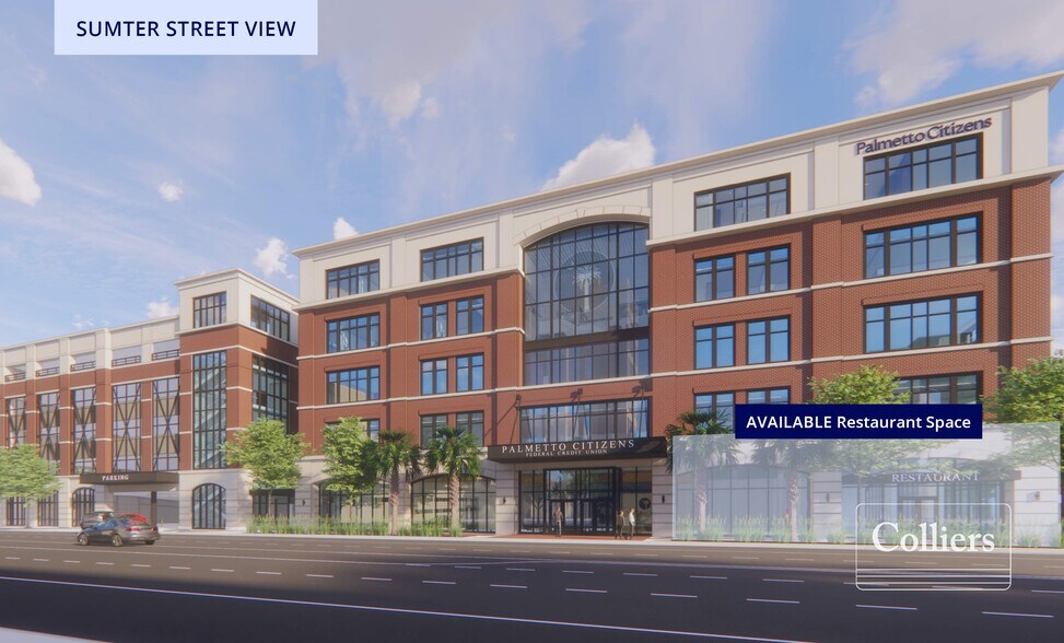Nouveau siège social, parking et restaurant haut de gamme de Palmetto Citizens Federal Credit Union. Situé au centre d'un quartier dynamique avec un quartier d'affaires florissant, cet emplacement offre une clientèle intégrée et diversifiée prête à soutenir votre entreprise. Le nouveau siège social de Palmetto Citizens Federal Credit Union transformera le bloc des rues Sumter, Lady et Washington au centre-ville de Columbia. Ce projet de construction de cinq étages et d'une superficie de 100 000 pieds carrés sera situé à l'angle des rues Lady et Sumter. Les plans comprennent un garage de stationnement de 325 places qui offrira un accès pratique aux employés et aux clients. Le projet combine des éléments architecturaux historiques et un design moderne, avec des espaces de bureaux et un restaurant au rez-de-chaussée avec salle à manger en plein air pour créer une atmosphère accueillante pour les travailleurs et les visiteurs.