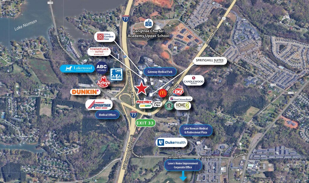 - Strong daytime population with close proximity to hotels, restaurants, medical office park, Duke Health Lake Norman Hospital and Lowe’s Corporate HQ