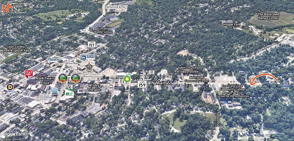 Espace à louer adjacent au Mannie Jackson Center for the Humanities. À 800 mètres du palais de justice du comté de Madison et à quelques pâtés de maisons du principal corridor commercial du centre-ville d'Edwardsville. Plus de 11 000 véhicules par jour (ADT) sur Main St (IL-159). Enseigne monumentale.
