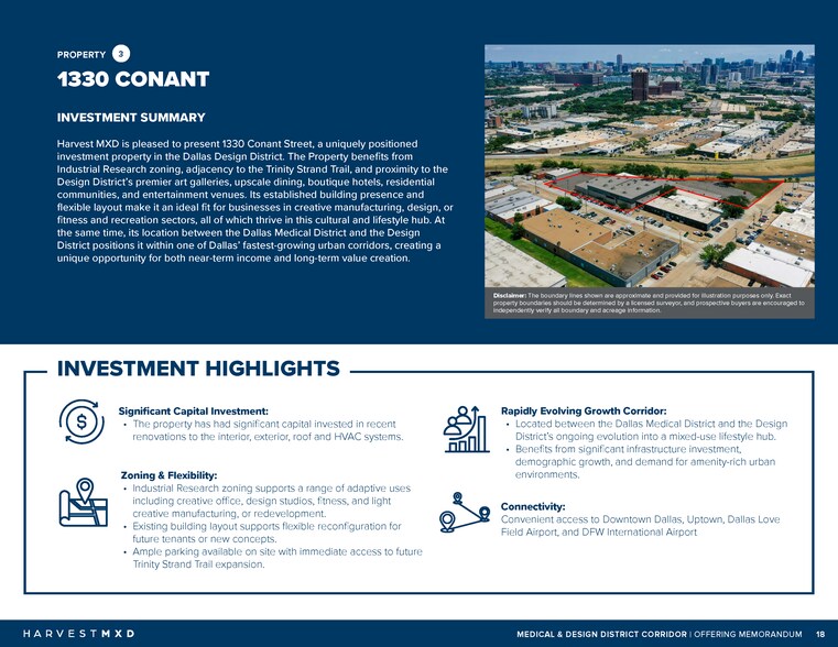 Harvest MXD is pleased to present 1330 Conant Street, a uniquely positioned investment property in the Dallas Design District. The Property benefits from Industrial Research zoning, adjacency to the Trinity Strand Trail, and proximity to the Design District’s premier art galleries, upscale dining, boutique hotels, residential communities, and entertainment venues. Its established building presence and flexible layout make it an ideal fit for businesses in creative manufacturing, design, or fitness and recreation sectors, all of which thrive in this cultural and lifestyle hub. At the same time, its location between the Dallas Medical District and the Design District positions it within one of Dallas’ fastest-growing urban corridors, creating a unique opportunity for both near-term income and long-term value creation.