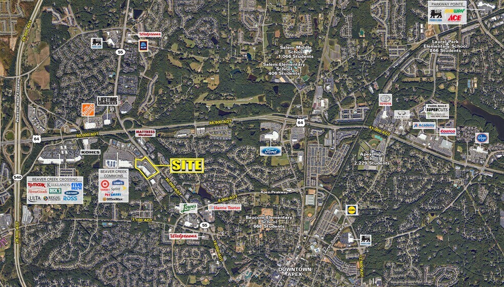 Situé dans le corridor de vente au détail dominant d'Apex, le centre dessert une vaste zone commerciale et est le centre dominant du marché. Positionné à l'intersection très fréquentée de la route 55 (31 500 ADT) et de la route 64 (49 000 ADT), le centre offre une grande visibilité avec de multiples points d'accès La banlieue #1 connaît la croissance la plus rapide aux États-Unis, selon Realtor.com