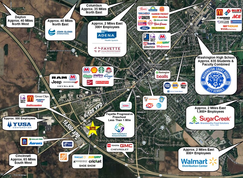 •Strong & Diverse Employment Base: Walmart Distribution Center (5 Miles Away, 800+ Employees), YUSA Corporation (1 Mile Away, ~500+ Employees), Adena Fayette Medical Center (2.5 Miles Away, ~300+ Employees), SugarCreek Packing Co (3 Miles Away, ~1,900 Employees), and Mckesson Corporation (12.5 Miles Away, ~3,000 Employees in Ohio)