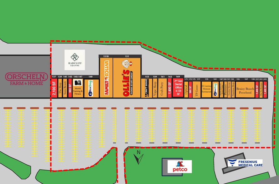 Radcliff Square, situé au 137-205 E Lincoln Trail Boulevard, offre d'excellents espaces commerciaux prêts à emménager situés le long d'un corridor commercial à Radcliff, au Kentucky. Ce centre commercial de 97 070 pieds carrés compte des locataires nationaux, dont Ollie's Bargain Outlet, Family Dollar et un certain nombre de locataires régionaux, ainsi que Bomgaars, présentateur de l'ombre. Radcliff Square bénéficie d'une base démographique stable grâce à sa proximité avec le fort Knox, situé à proximité. La réserve militaire de Fort Knox, la sixième plus grande communauté urbaine du Kentucky, est située à environ cinq milles au nord du site et compte plus de 40 000 soldats, membres de familles et employés civils. Les suites commerciales de ce centre sont disponibles à la location pour tout, des devantures de magasins traditionnels et des restaurants aux bureaux en passant par les fournisseurs de services médicaux ou autres fournisseurs de services professionnels. La propriété est ouverte aux ententes créatives. Le propriétaire, Woodcrest Capital, accueille les entreprises pour la première fois et les franchises dans ses centres avec des baux faciles à lire et des conditions souples. Woodcrest est également suffisamment sophistiqué pour plaire au plus grand des locataires de crédit nationaux. En tant qu'entreprise familiale avec plus de 40 ans d'expérience dans l'immobilier commercial, Woodcrest possède et exploite tout, des centres de classe A dans les quartiers les plus fréquentés aux centres en difficulté qu'elle réhabilite dans les communautés rurales en difficulté. Appelez dès aujourd'hui pour trouver le bon emplacement pour votre entreprise, car Woodcrest a généralement de multiples occasions de vente au détail dans la région immédiate !