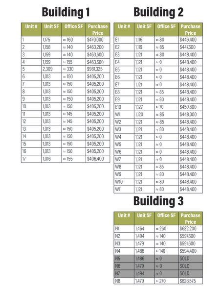 • Total Project SF: 54,626 SF - Building 1 – 21,145 SF • Thirty-eight (38) standard flex units featuring fully built office and warehouse space • Eight (8) hobby-cave units with fully built warehouse and restroom-only layouts • Gas-forced air heating • One 12’ x 14’ grade-level door per unit • One restroom per unit • HVAC system servicing all office areas • Energy-efficient LED lighting • Power: 200 amps, 208V, 3-phase electrical service per unit - Building 2 – 23,540 SF - Building 3 – 11,860 SF • Total Units: 46 • Total Parking: 174 Spaces • Clear Height: 18’ • Potential Pull Through Capability • Zoning: GC-1 • Total Acreage: 3.37 • Prime Bluffdale Location with Bangerter Highway Visibility, and Quick Freeway Access