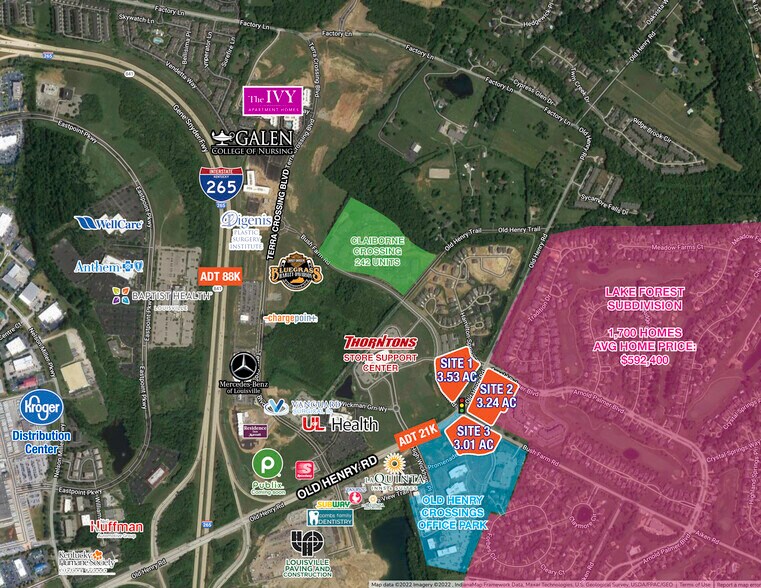 Bail foncier ou BTS - SITE 1 : 14801 BUSH FARM RD., LOUISVILLE, KY 40245 - 3,53 ACRES EMPLACEMENT 2:13910, VIEUX CHEMIN HENRY, LOUISVILLE, KY 40245 - 3,24 ACRES SITE 3:13905 PROMENADE GREEN WAY, LOUISVILLE, KY 40245 • À côté du parc à bureaux Old Henry Crossings qui comprend ARGI Financial, Semonin, Parallon et Schulte Hospitality • Près de Publix (bientôt disponible), Mercedes Benz, UoFL Health et Harley Davidson • Près de l'entrée principale de Lake Forest, l'un des quartiers les plus riches de Louisville • Accès facile à l'autoroute I-265 et au chemin Old Henry • Zoné CN (site 1), R5A (site 2), C1 (site 3)