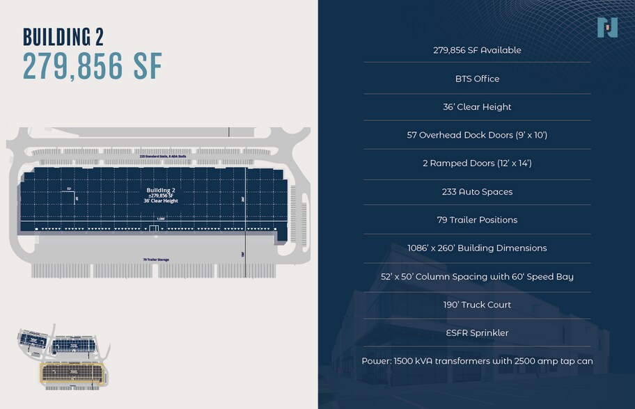 - 7" CONCRETE SLAB ON 10 MIL. VAPOR BARRIER - CONCRETE TILT WALL PANELS - ESFR FIRE SPRINKLED - 36' CLEAR HEIGHT. - IIB CONSTRUCTION - 59 OVERHEAD DOOR COUNT: 57 (9' x 10') + 2 (12' x 14') @ RAMP - 79 TRAILER STORAGE - 233 TOTAL PARKING: 225 STANDARD + 8 ACCESSIBLE STALLS