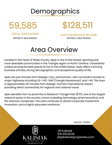 INVESTMENT HIGHLIGHTS ±3.92 acres Zoning: HD MF-CZ (High Density Multifamily), O&I-CZ (Office & Industrial) Easy access to Hwy 64, Hwy 55, and I-540 Zoning approved for townhome development 21,500 vehicles per day on Center St., 76,500 on US 1