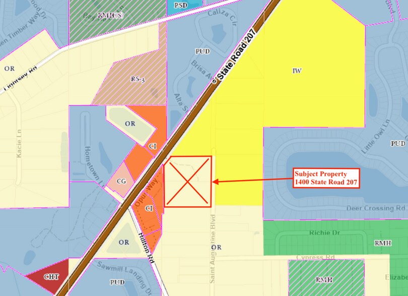 9.1 acres in a prime location on State Road 207 in St Augustine. This parcel features 161 feet of frontage on SR 207 with an extremely high annual average daily traffic count of 35,000. Currently zoned Open Rural, but is designated mixed use on the St. Johns County FLUM (Future Land Use Map). This parcel is surrounded by a variety of high-intensity zonings. The land adjacent to the north and east are zoned IW (Industrial Warehouse). The land adjacent to the west and the land directly across SR 207 is zoned CI (Commercial Intensive). The location is superb as it is both close to town and also I-95. This is the first time the property has been available in many decades as its been in the same family since the late 1970's. Huge potential as multi-family, industrial warehouse or a wide variety of other commercial uses.