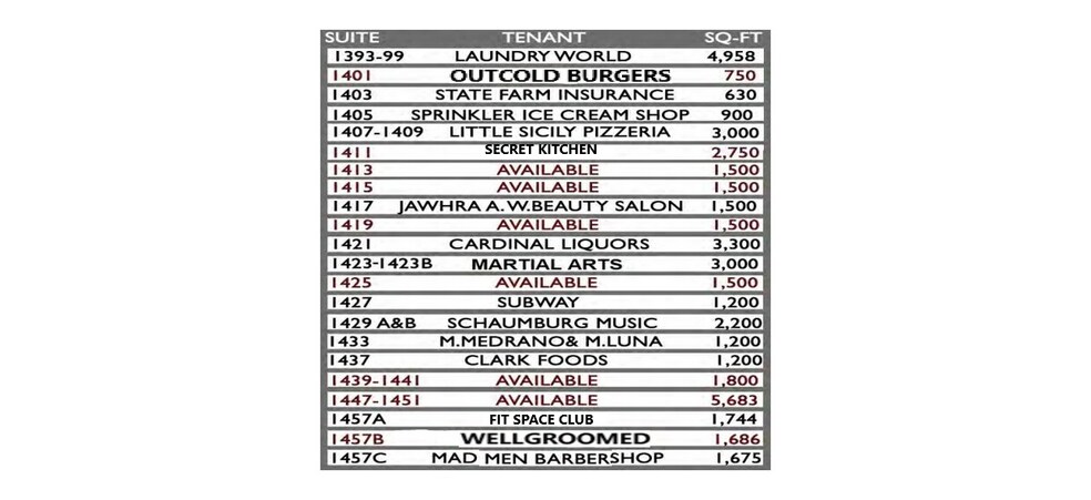Possibilité de location au détail à Schaumburg Plaza. Le centre a des espaces allant de 630 à 15 000 pieds carrés, un grand stationnement avec un ratio de 4,86 places par 1 000 pieds carrés, et une grande visibilité le long de Schaumburg Rd., cet emplacement privilégié est idéal pour les entreprises. Bénéficiez de données démographiques solides, y compris un revenu moyen du ménage supérieur à 100 000$, un âge médian de 39,7 ans et une population de 240 000 habitants à moins de 5 milles. Joignez-vous à des locataires prospères comme Cardinal Liquors, Little Sicily Pizzeria, Schaumburg Music Academy, Nutrition Connection Balance, Art Fuzd, Mad Men Barbershop, Jawhra Salon, Manny's Burrito Express, Subway, Xtra Mile Running, State Farm Insurance, Sprinkles Ice Cream Shoppe et Laundry World.