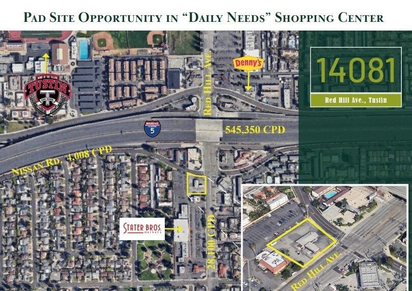 Outparcel pad on Major Market anchored (Stater Bros ) shopping center. Located at signalized intersection of Red Hill Ave and Nissan Rd., Tustin CA