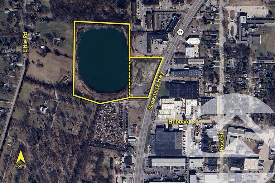 La route Groesbeck et le lac. Grand mur de soutènement à l'extrémité est du lac. Bâtiment existant de 1 120 pieds carrés sur le site. Une partie de la parcelle est dans le canton de Clinton. La propriété contient un lac existant.