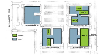 Il y a actuellement 2 090 à 6 966 SF disponibles dans cet édifice du Livonia Metro-Plex, le plus grand parc de haute technologie de Livonia. Ce parc d'affaires attrayant de quatre bâtiments est situé dans un district de zonage RE (recherche et ingénierie) qui permet une vaste gamme d'utilisations de bureau, de flexibilité et de haute technologie. Livonia Metro-Plex offre de nombreuses caractéristiques attrayantes, y compris une capacité de stationnement supplémentaire, des bâtiments entièrement climatisés, des aires de stockage intégrées et une grande puissance - ce qui en fait une excellente occasion pour le commerce électronique, médical, construction, fabrication et distribution logistique. Le Metroplex est niché dans un cadre serein entouré d'arbres matures, de sentiers pédestres et d'un aménagement paysager impeccable. L'emplacement pratique est adjacent à l'autoroute I-96 qui donne un accès direct à l'ensemble du marché métropolitain de Detroit.