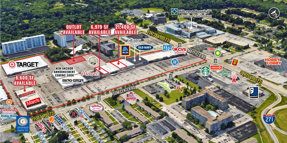 Eastgate est un centre commercial super-régional idéalement situé près de l'Interstate 271 avec un accès rapide à l'Interstate 90 menant au centre-ville de Cleveland et à l'Interstate 480 menant aux banlieues sud et ouest de Cleveland. Le centre offre 1 900 pieds de façade sur SOM Center Road à l'intersection du chemin Mayfield (SR 322), qui est partagé avec Hobby Lobby et l'hôpital Hillcrest (496 lits), reconnu 11 fois comme l'un des 100 meilleurs hôpitaux américains Les ancres comprennent Target, Marc's, ALDI, Old Navy, ULTA, Michaels, Five Love et CVS Les détaillants de la région comprennent Hobby Lobby, Costco, Best Buy, Giant Eagle, Marshalls, Fresh Thyme, Ross Dress for Less, Guitar Center et JOANN Une forte population diurne, un quartier résidentiel dense et l'accès aux quartiers à revenu élevé contribuent tous au succès d'Eastgate DISPONIBLE : -21 400 points d'ancrage SF -6 979 PI2 d'espace nouvellement créé -6 600 pi2 d'espace de salon de coiffure à extrémité -Terrain de sortie proposé jusqu'à 7 500 PI2
